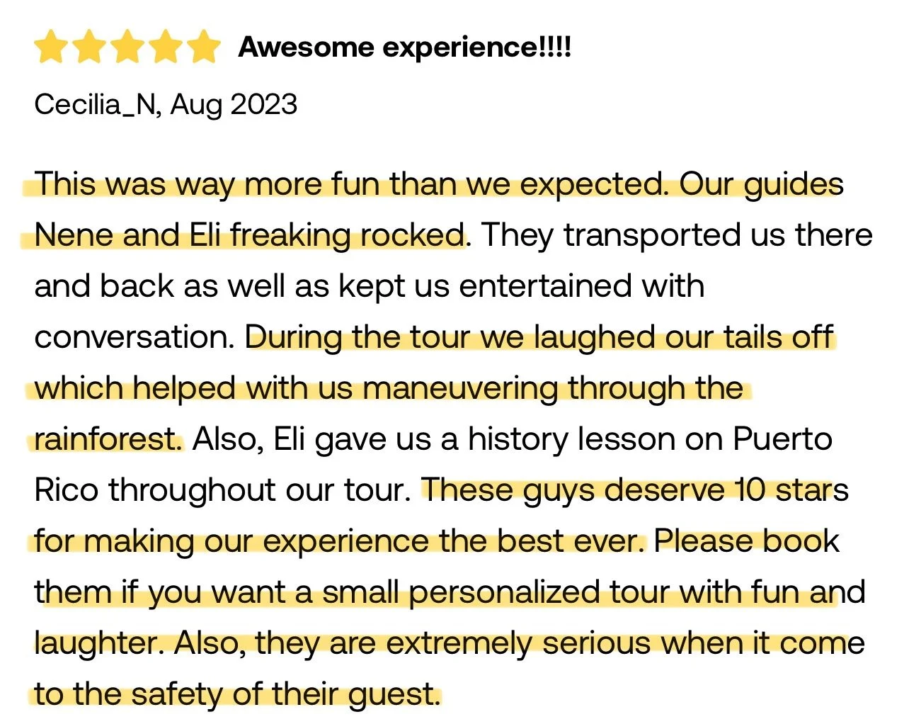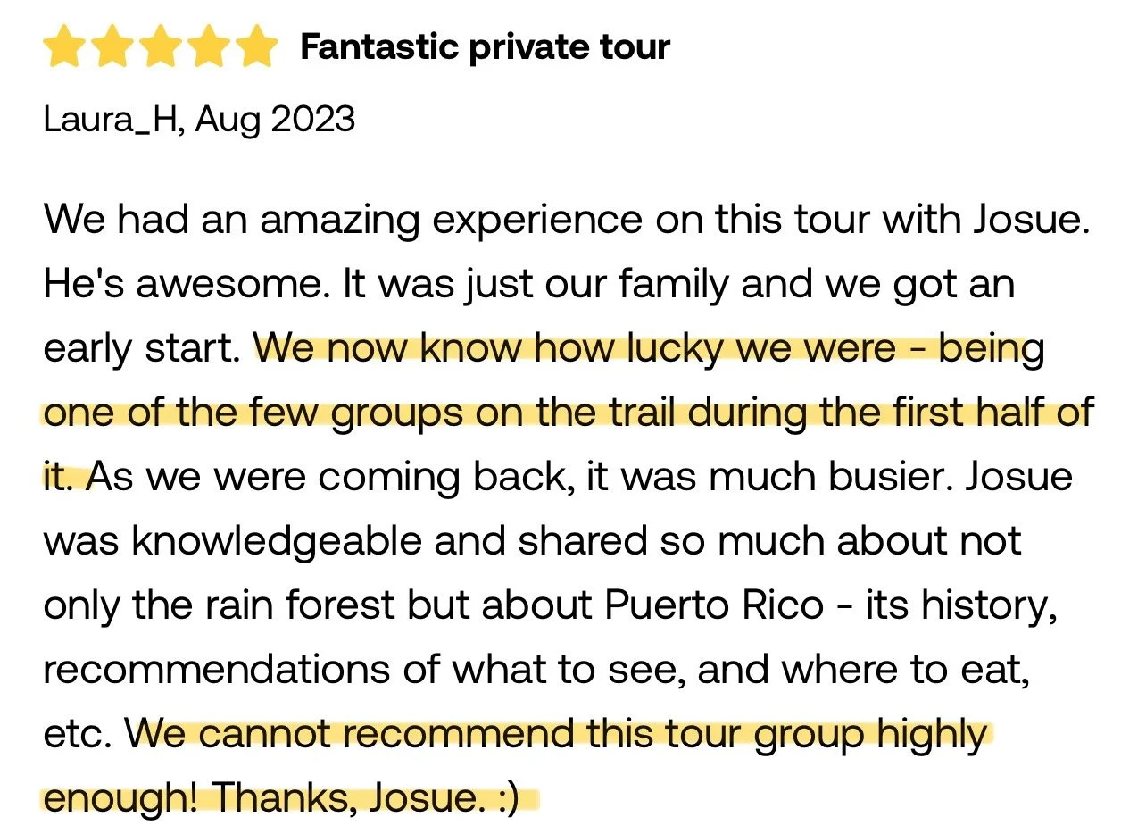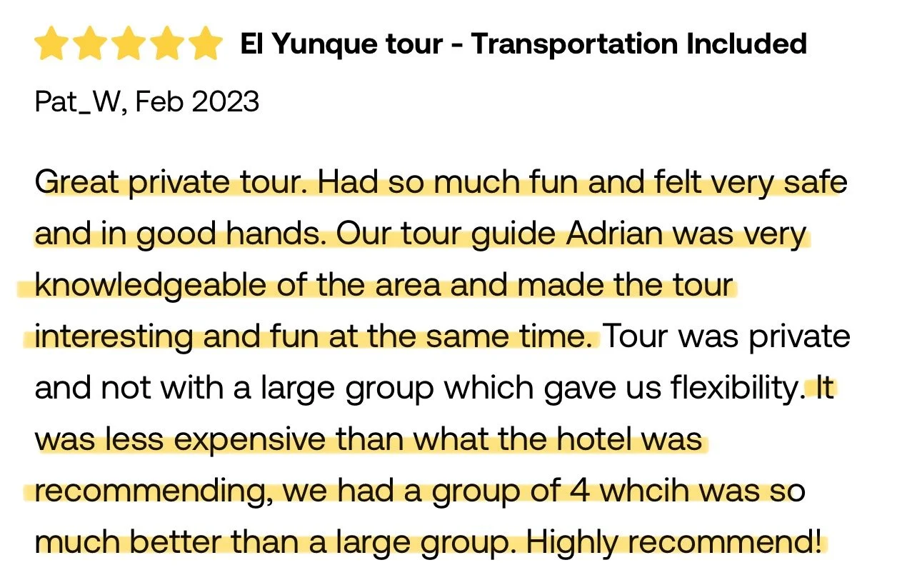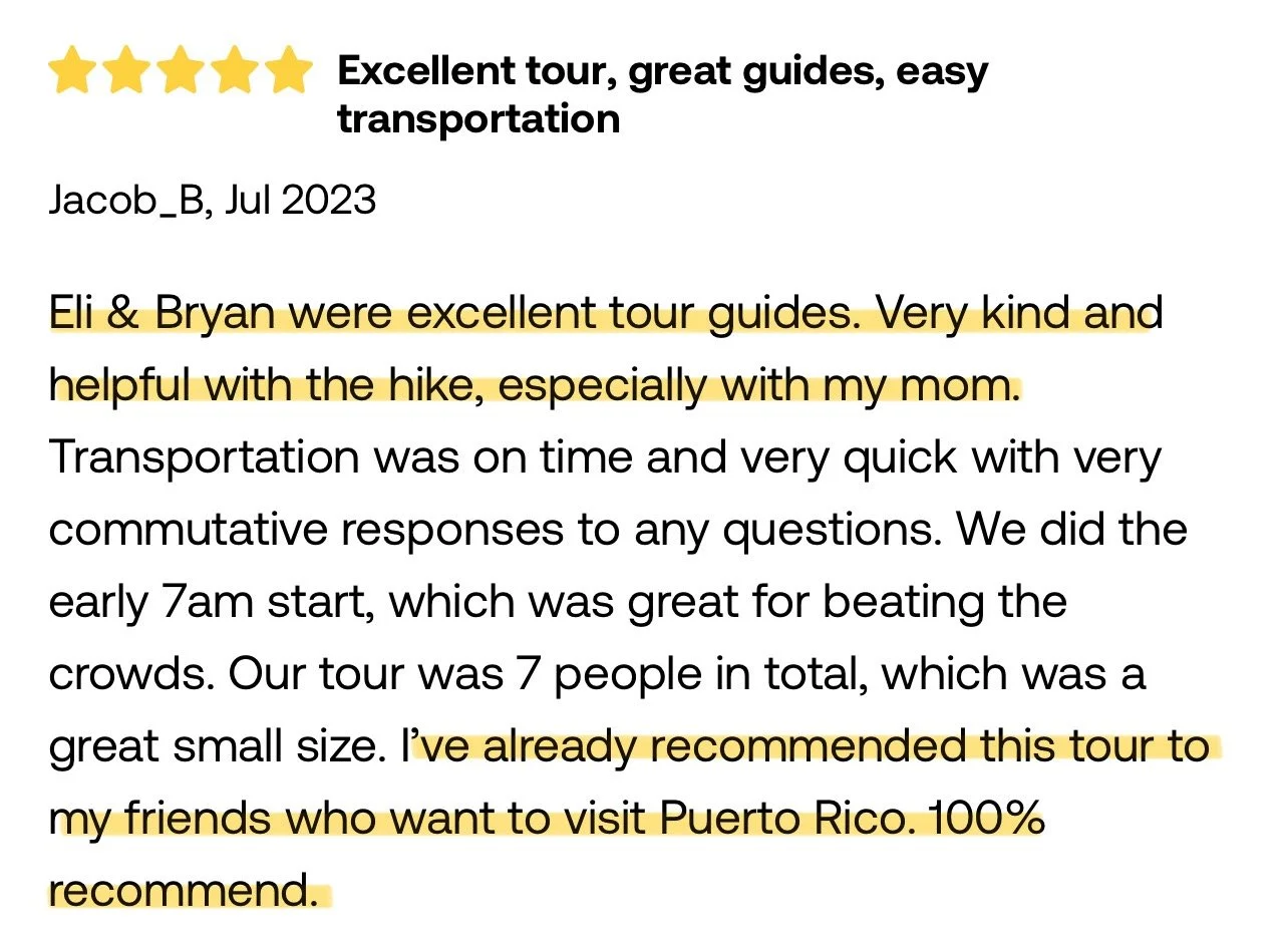 You will be picked up at your preferred hotel, resort, residence, Airbnb or Cruise Port in San Juan, Isla Verde or Condado (Although hotels in Rio Grande or Fajardo may not qualify, we can arrange a convenient meeting point near your accommodation for your ease and comfort).